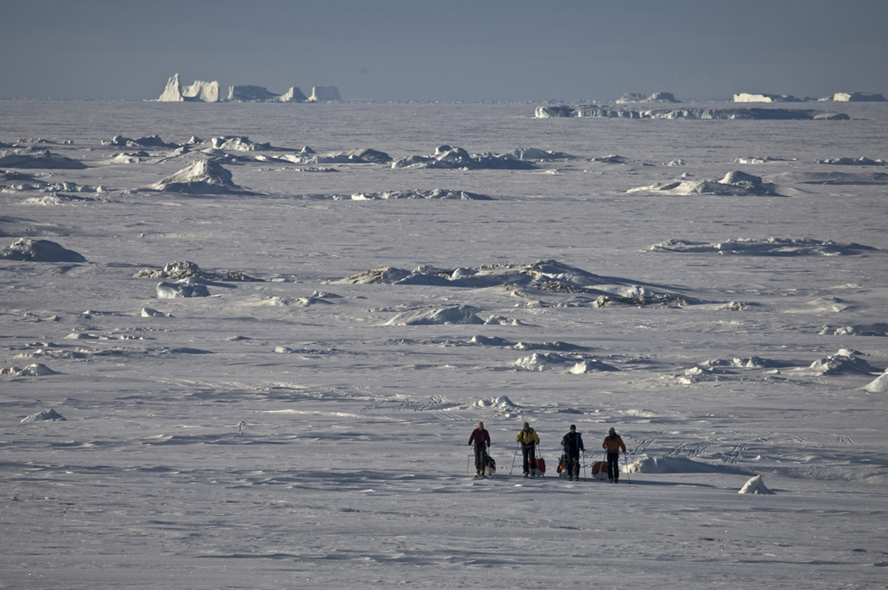 Kanada, Baffin Island, Baffin Bay, Mit Ski und Pulka geht es durch das Rough Ice nach Cape Christian.